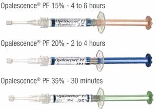 เจลฟอกสีฟันยี่ห้อOpalescence35%เป็นเจลฟอกสีฟันยี่ห้อแรกที่ได้รับการยอมรับจาก องค์กร ADA ที่มีเจลลักษณะเหนียวและมีคุณสมบัติเป็นเอกลักษณ์ ซึ่งผลของความขาวจะใช้เวลาน้อยกว่าสัปดาห์ก่อนหน้านี้ เจลฟอกสีฟันชนิดทำเองที่บ้านจะใช้เวลานาน ซึ่งมีระดับที่หลากหลาย ส่วนประกอบของเจลฟอกสีฟันOpalescence คือ คาร์บาไมด์ พร็อกไซด์ Opalescence PF คาร์บาไมด์ พร็อกไซด์ มีความเข้ม 10% 15% และ 20% ตัว PF นี้ ซึ่งจะใช้ตัวฟลูออไรด์ และโปแทสเซียมไนเตรท ที่เพิ่มเข้าไปเพื่อลดอาการเสียวฟัน